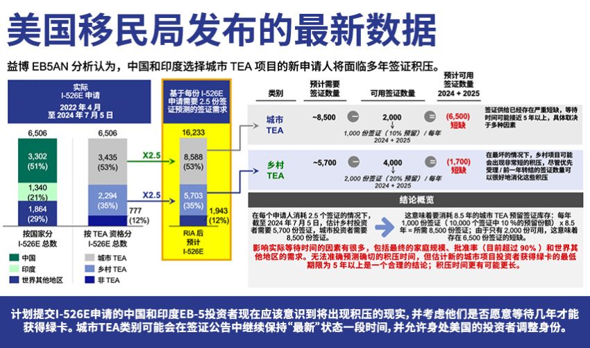 - 中国和印度的城市类别投资者可能会面临积压。 大量印度和中国投资者投资城市高失业率项目(截至2024年7月数据),这表明新申请的印度和中国投资者可能已经要面临多年积压。虽然可以做出各种假设和推断,但如果申请这一类别,我们预计在合理的假设前提下需要五年或更长时间才能获得绿卡。
