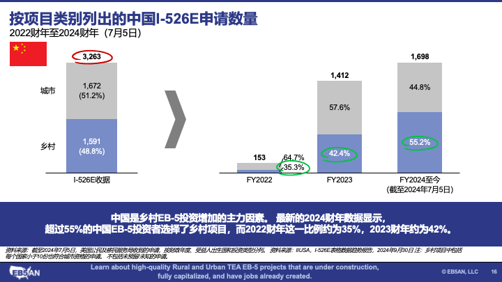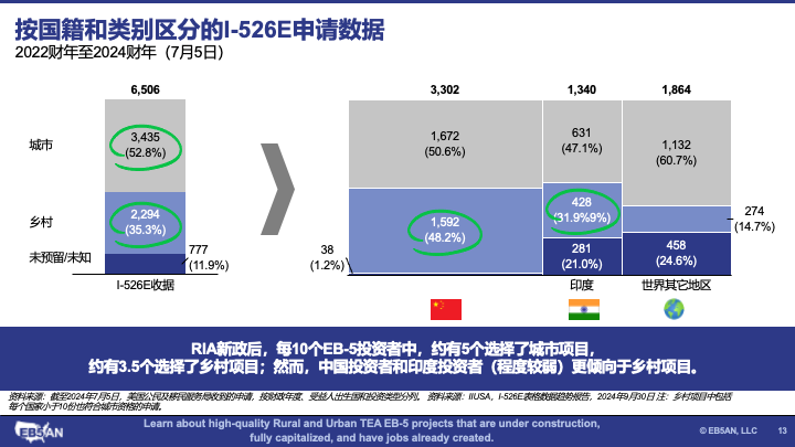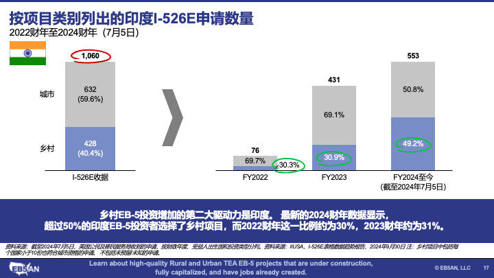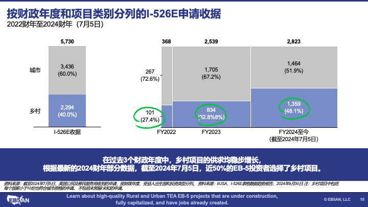 - 对乡村项目的需求正在增长。 总体而言,大多数RIA新政后的EB-5投资者都投资了城市项目。然而,数据显示出了对乡村项目的需求不断增长的市场趋势。这一明显的转变表明,到2024财年下半年,对城市和乡村项目的需求大约可以达到持平。