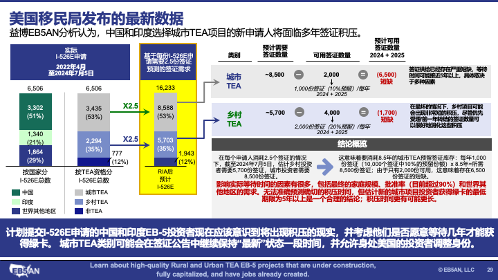 与我们在EB-5行业中看到的其他一些分析不同,我们不会发布片面的分析,也不会从数据中精挑细选,来营销我们的项目。例如,今年早些时候,我们是EB-5行业中第一批报告对于一些投资者而言,城市预留签证类别可能会出现积压问题的公司之一。虽然可能在有些人看来,尽管我们有城市项目,但仍然分享了这些信息,但实际上我们这样做正是因为我们有城市项目。
