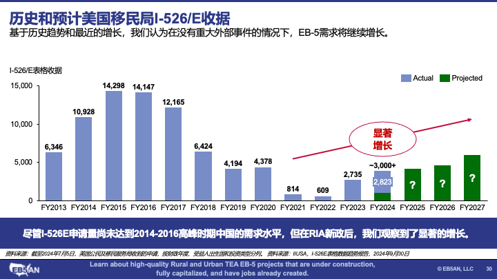 尽管EB-5计划申请量尚未达到2014-2016高峰时期的需求水平,但在RIA新政下,I-526E申请,特别是乡村项目的申请,很可能会继续增加。