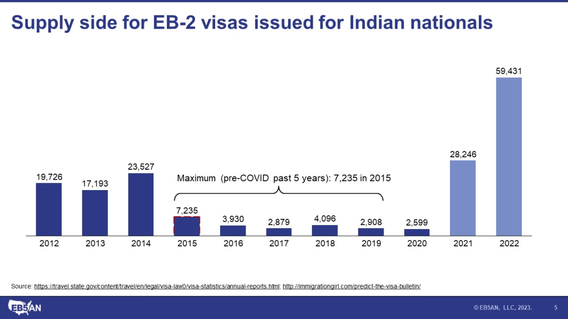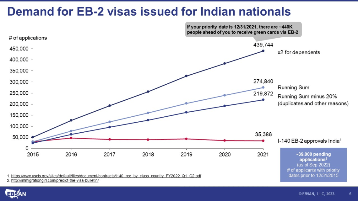 The long wait for EB-2 Visa applicants can be ascribed to the imbalance between supply and demand. The supply refers to the number of visas issued for EB-2 Indian nationals, while the demand refers to the number of people applying for EB-2 visas from India.