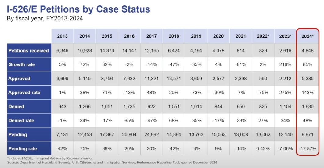 In 2024, approvals also increased significantly, with many investors, including pre-RIA applicants, receiving their visas. This shift suggests that USCIS has prioritized clearing the backlog and processing applications efficiently. Such efforts have particularly benefited Chinese nationals, who have historically faced longer wait times. Clearing these backlogs not only speeds up the process for new applicants but also minimizes visa waste.