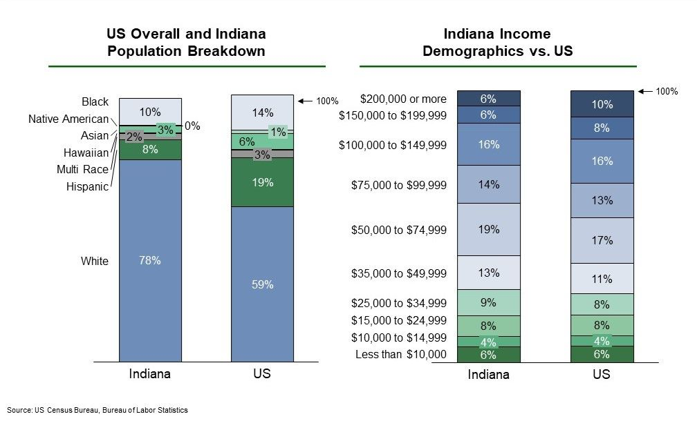 According to the U.S. Census, Indiana has a population of approximately 6,805,985. Of this, approximately 3,419,218 people are in the civilian labor force: 3,259,178 employed and 160,040 unemployed.
