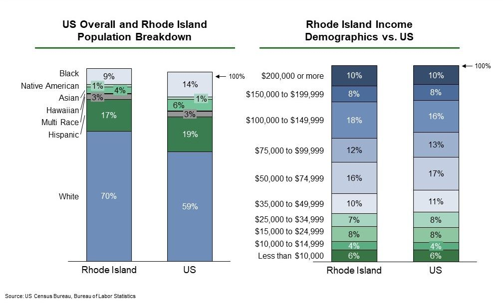 According to the U.S. Census, Rhode Island has a population of approximately 1,095,610. Of this, approximately 591,545 people are in the civilian labor force: 546,249 employed and 45,296 unemployed.