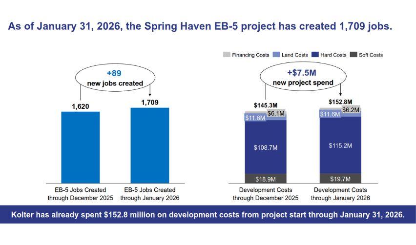 As of January 31, 2026, $7.5 million of new development expenditures created approximately 89 new EB-5 jobs, bringing the total to 1,709 jobs, which is well above the required amount.