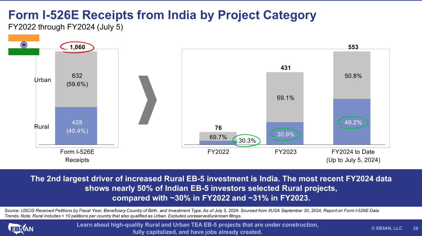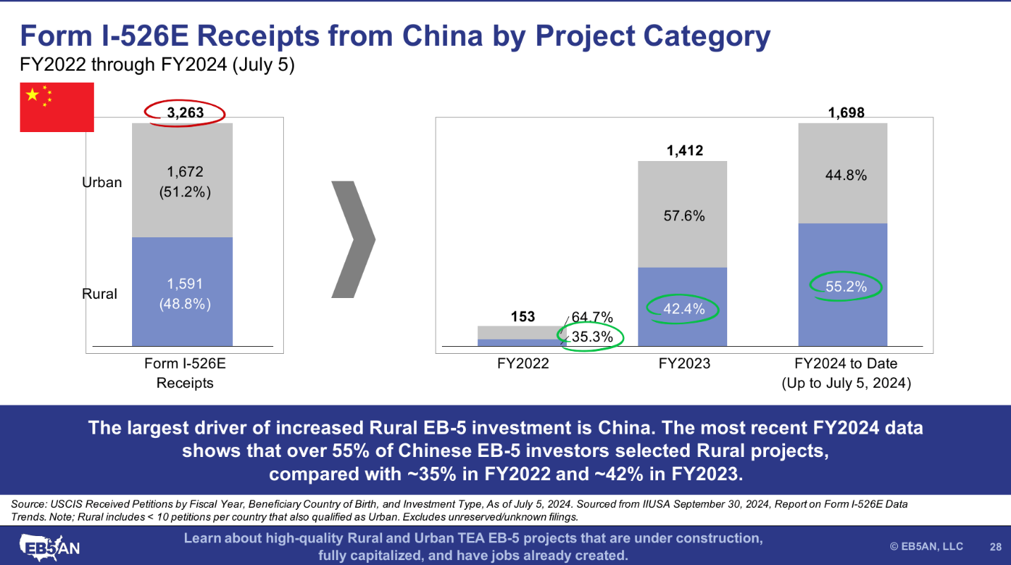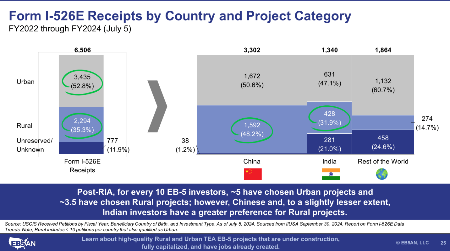 As we will examine below, both the Chinese and Indian markets are seeing increased demand for rural EB-5 projects. Still, since FY2022 to July 2024, most EB-5 investors overall have chosen urban projects. Specifically, investors from both China and India have more pending Form I-526E petitions for urban than for rural.