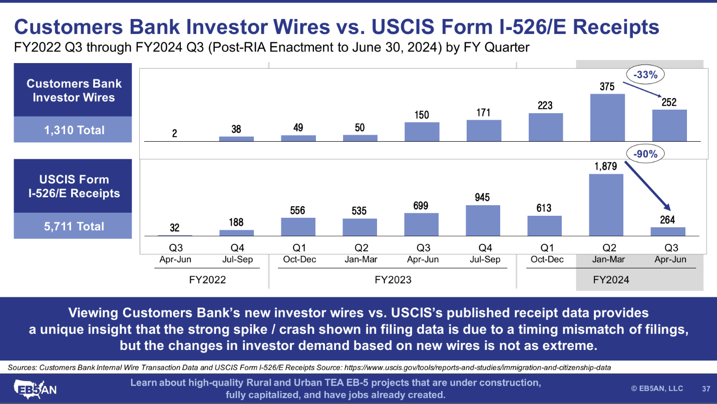- Overall demand for EB-5 appears steady. Although Form I-526E filings appeared to decline 90% in Q3 FY2024 after the April 1 fee increase based on the USCIS published data, the new investor funding data from Customers Bank tells a different story. We believe that EB-5 demand was and will continue to be smoother than the Form I-526E receipt charts show. This decline was caused by a rush of filings by a certain date for investors whose petitions had been in progress for many months, not by an actual dip in demand for EB-5 visas.