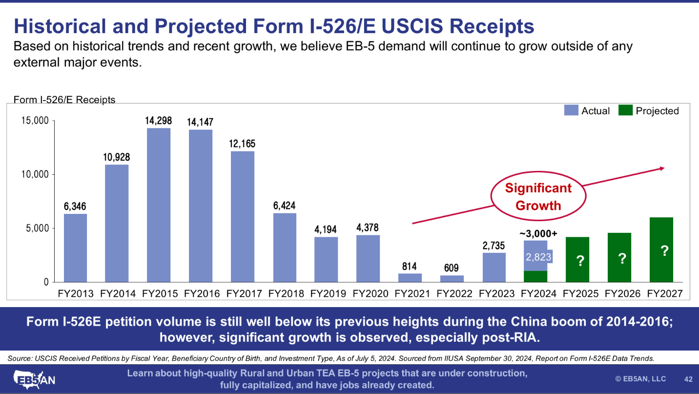 Even though the EB-5 program has not reached the demand levels seen in the peak years of 2014–2016, Form I-526E filings, especially in rural projects, are likely to continue to increase under the RIA.