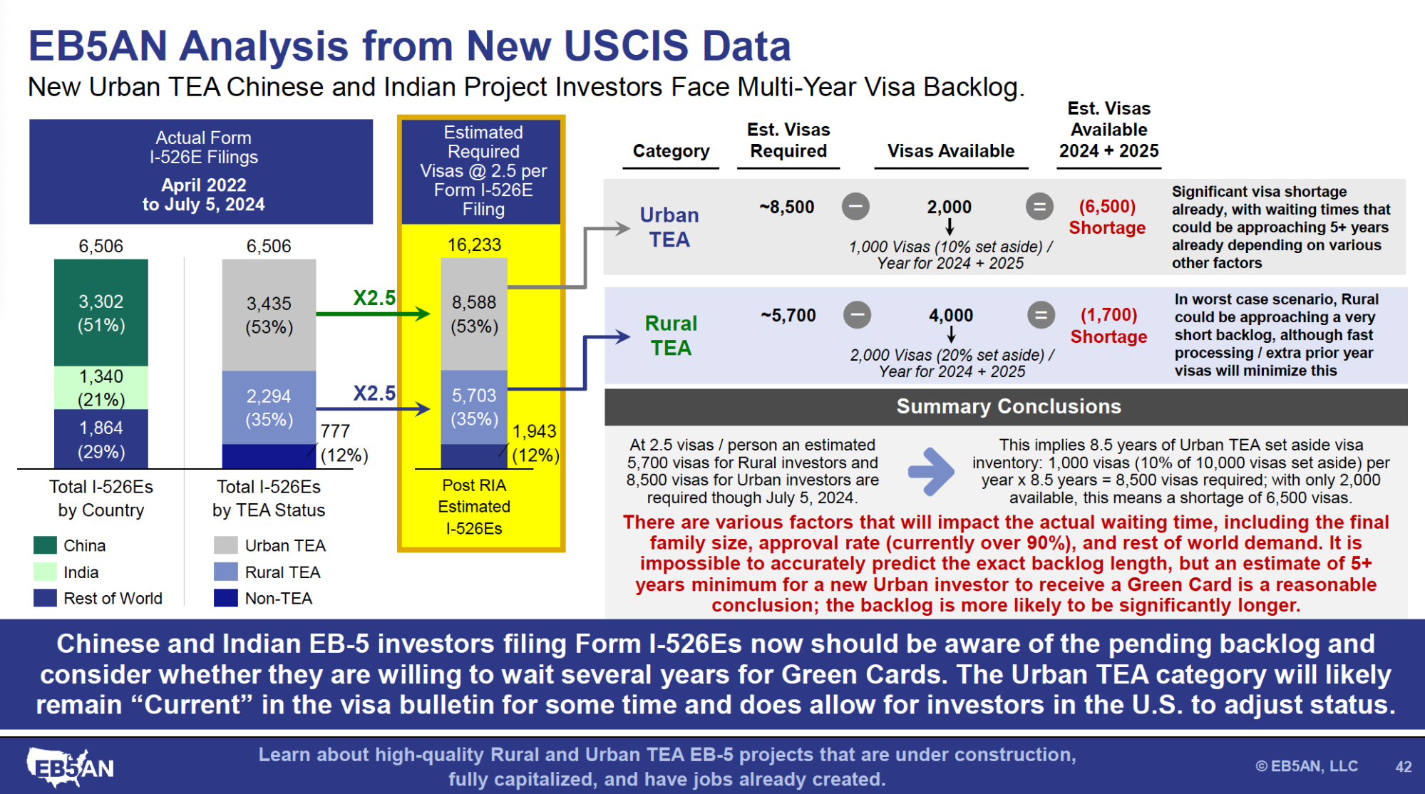This shortage of 6,500 urban visas would imply a backlog of at least five years for investors from countries with high demand for EB-5 visas. Depending on factors such as the actual number of dependent family members on each application and the Form I-526E approval rate, the backlog may be much longer.
