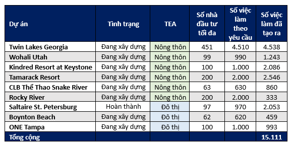 Việc phát triển các dự án này đã tạo ra hơn 15.000 việc làm EB-5 đủ điều kiện. Mức độ tạo việc làm này đáp ứng yêu cầu cho 1.187 nhà đầu tư vào các dự án này, và dự kiến sẽ có thêm việc làm được tạo ra khi quá trình xây dựng cứ tiếp diễn.