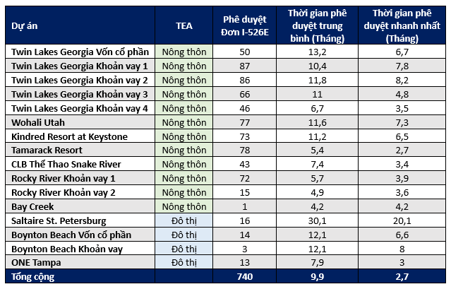 Bảng bên dưới tóm tắt số lượng phê duyệt, thời gian phê duyệt trung bình và thời gian phê duyệt nhanh nhất, đối với mỗi dự án EB5AN được nộp kể từ RIA ra đời mà đã nhận được phê duyệt I-526E. Trong giai đoạn này, USCIS đã phê duyệt số lượng hồ sơ cho các dự án nông thôn nhiều hơn đáng kể so với hồ sơ cho các dự án đô thị.