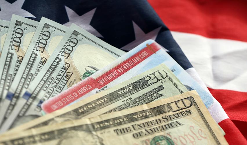 Close-up of U.S. dollar bills with an employment authorization document card on top, symbolizing financial and work benefits of an EAD for EB5 investors.