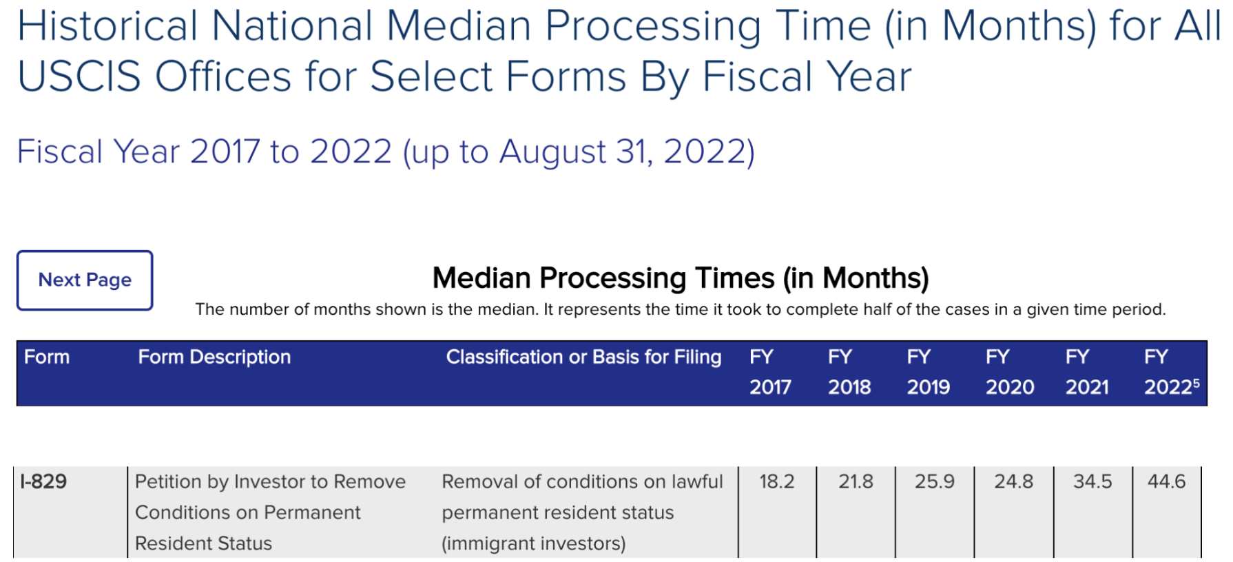 Median processing times for Form I-829, 2017-2022, as of October 2022.