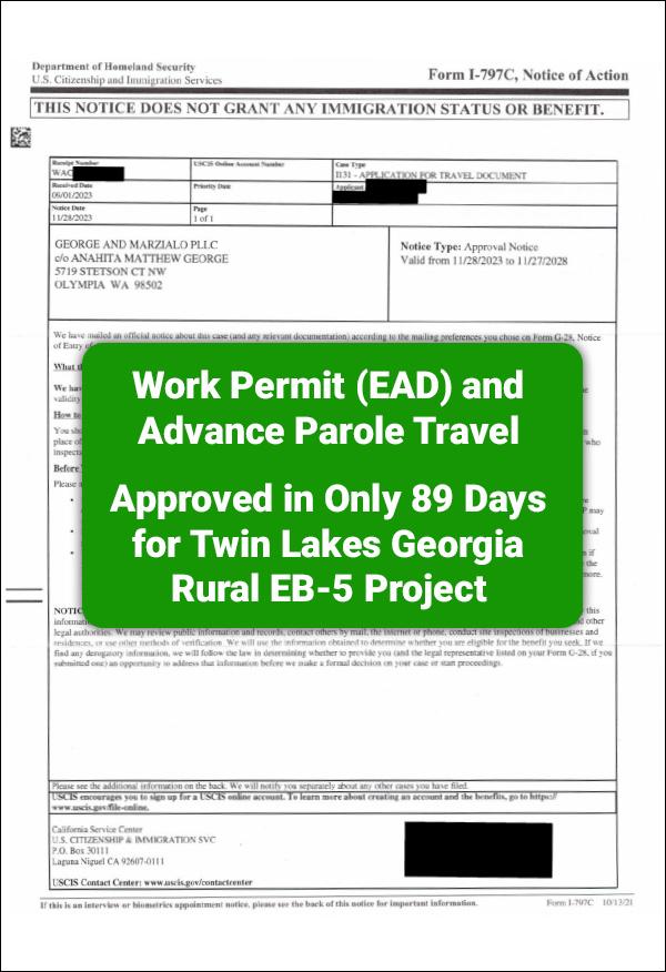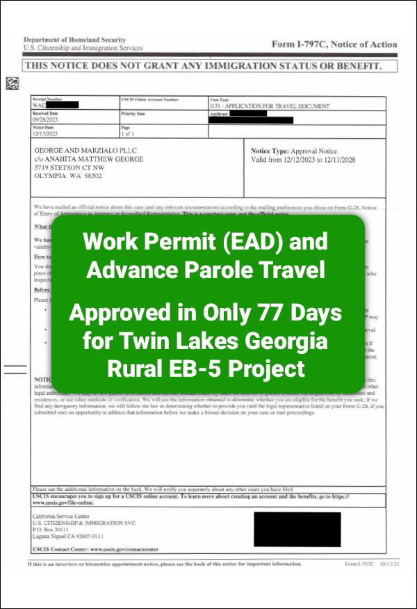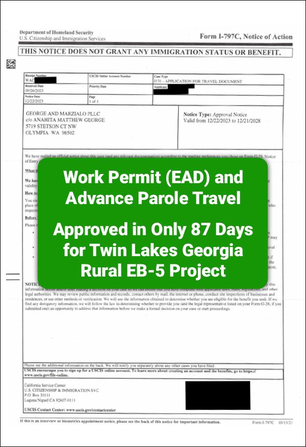 Five New EAD and AP Approvals for EB-5 Investors in Twin Lakes Georgia