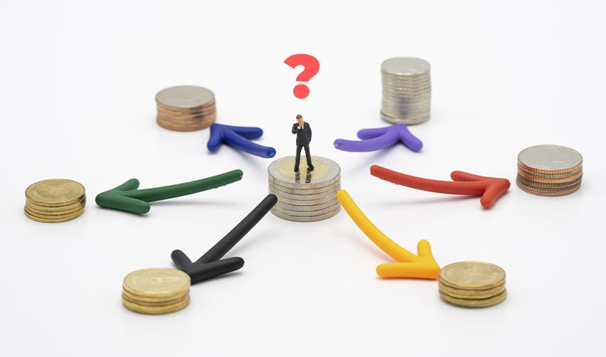 A figurine of an EB5 investor standing on a stack of coins, looking at other capital stack options with a question mark above his head.