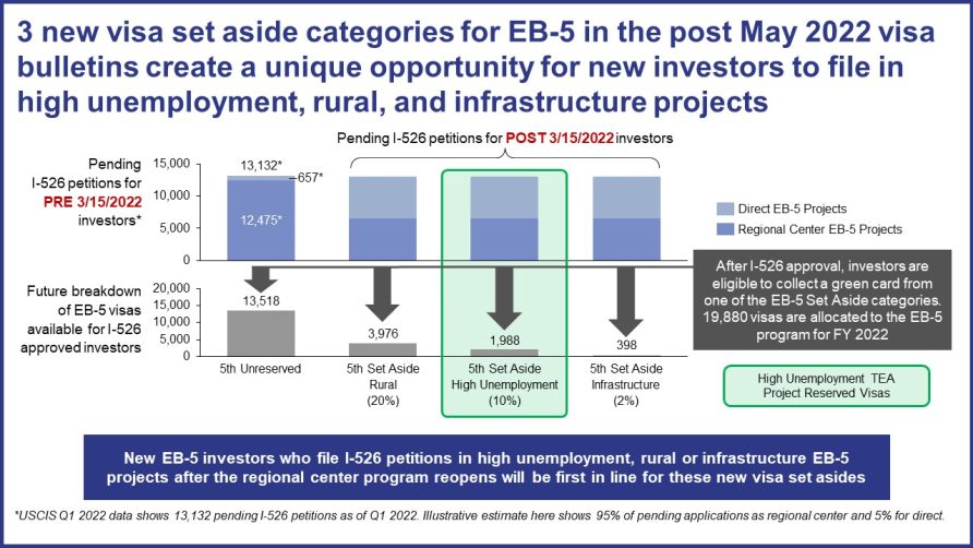 Under the EB-5 Reform and Integrity Act, the DOS now reserves 32% of the total number of EB-5 visas for investors in the three TEA categories: infrastructure projects, rural, and high unemployment. Investors of any nationality who submit Form I-526 as of March 15, 2022, can be eligible for a reserved visa.