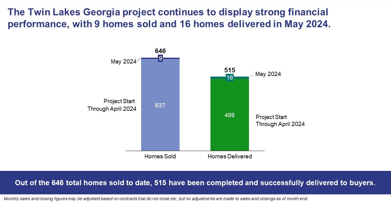In May 2024, there were 16 new home closings and 9 new homes sales, continuing the strong momentum. The 16 new home closings represent more than $10 million in revenue for the Twin Lakes project.
