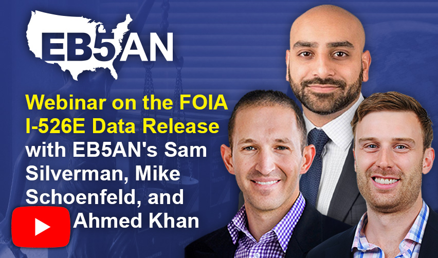 On May 8, 2025, EB5AN held a webinar discussing the latest I-526E filing data released by USCIS, now spanning from 2022 to January 31, 2025. These data were released through Freedom of Information Act (FOIA) requests. EB5AN managing partners Sam Silverman and Mike Schoenfeld hosted the webinar and were joined by VP Ahmed Khan.
